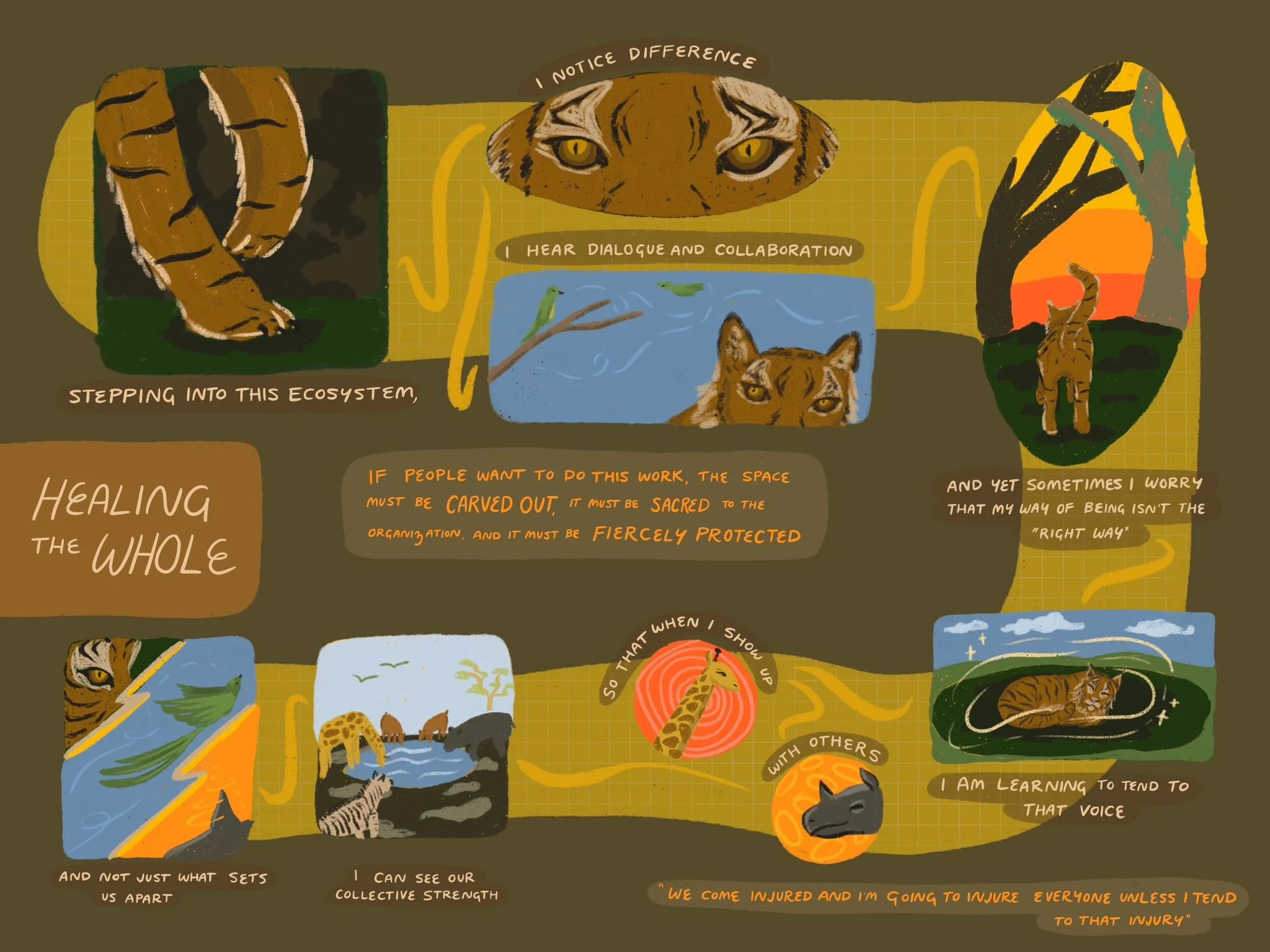 In collaboration with Ella Scheepers, we developed a series of illustrations about the importance of care work within organizations. With a mixture of storytelling, anecdotes from her research, article quotes, and visual metaphors, these images invite us to reflect and feel the ways in which our individual wellbeing fractals into the wellness of the collective.
